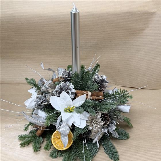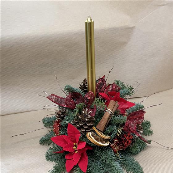 A round table posy, made with Christmassy foliage, picks & dried fruit. Large table centres pictured with a larger candle, whereas standard has a taller candle.