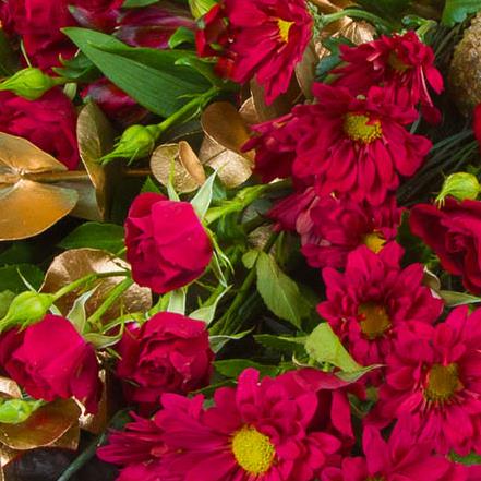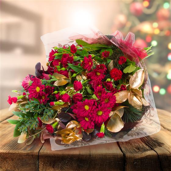 A lovely mix of deep, rich reds blooms and seasonal foliage. This traditional style bouquet is simply wrapped to enable the recipient to arrange their gift as they wish.