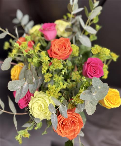 12 mixed coloured roses in a random assortment, arranged with foliage and gift-wrapped. Colours are selected at random, excluding red and pale pink. Presented in water and ready to display, a vibrant Valentine’s gift.