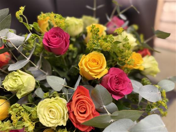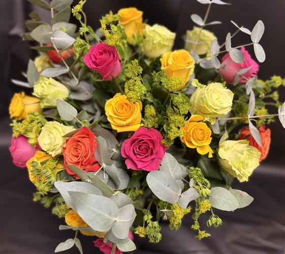 24 mixed coloured roses in a random assortment, arranged with foliage and gift-wrapped. Colours are selected at random, excluding red and pale pink. Presented in water and ready to display, a vibrant Valentine’s gift.
