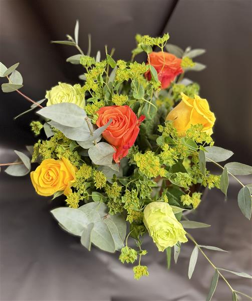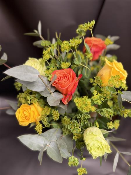6 mixed coloured roses in a random assortment, arranged with foliage and gift-wrapped. Colours are selected at random, excluding red and pale pink. Presented in water and ready to display, a vibrant Valentine’s gift.