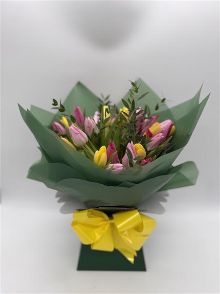A bright and cheerful bouquet of mixed tulips, beautifully arranged for gifting. Perfect for surprising someone special or simply treating yourself, presented ready to display.