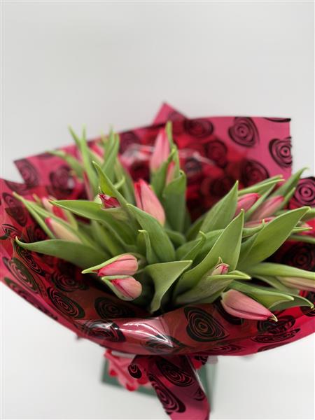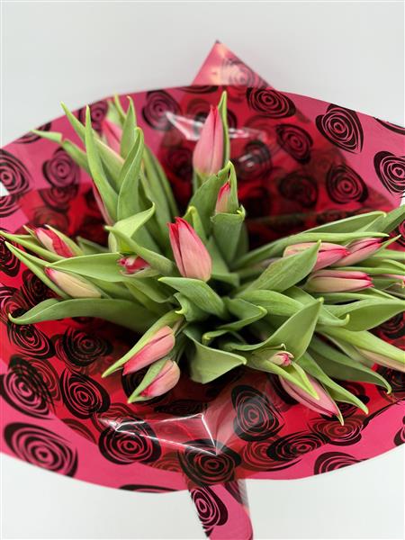 A stunning bouquet of deep red tulips, beautifully arranged for a romantic gesture. Perfect for expressing love and admiration, ready to display and enjoy straight away.