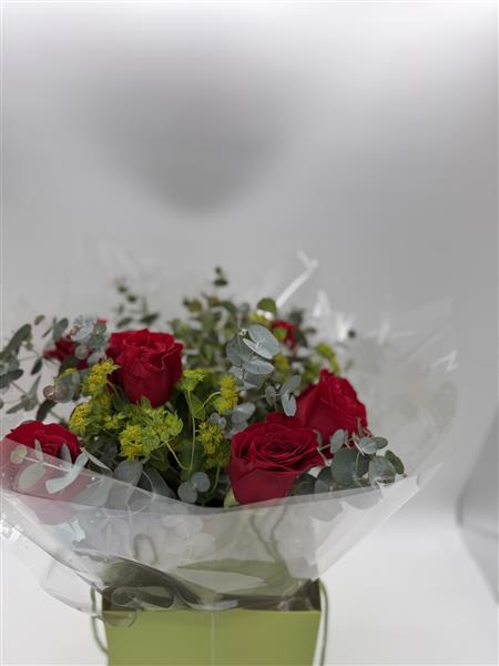 A stunning arrangement of 6 premium Freedom red roses, carefully arranged with mixed foliage and finished with luxury gift wrapping. Delivered in water and ready to display, perfect for expressing love and admiration.
